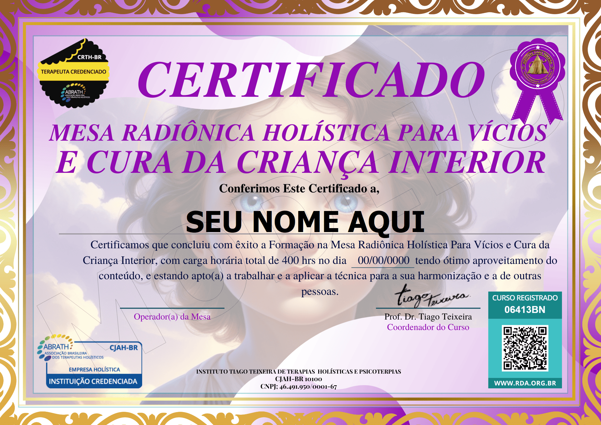 Parabéns, Terapeuta da Mesa Radiônica Holística Para Vícios e Cura da Criança Interior