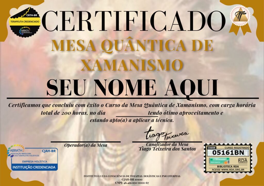Ao finalizar este curso, você receberá este certificado com reconhecimento internacional pela ABRATH e poderá atuar como TERAPEUTA DA MESA SISTÊMICA.